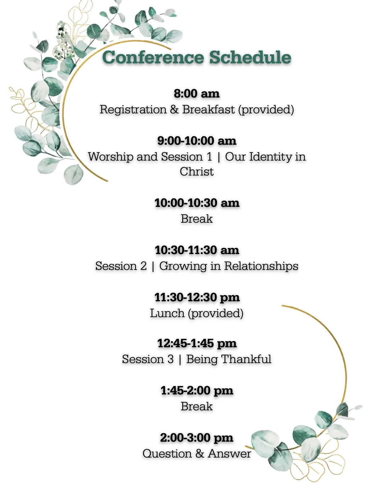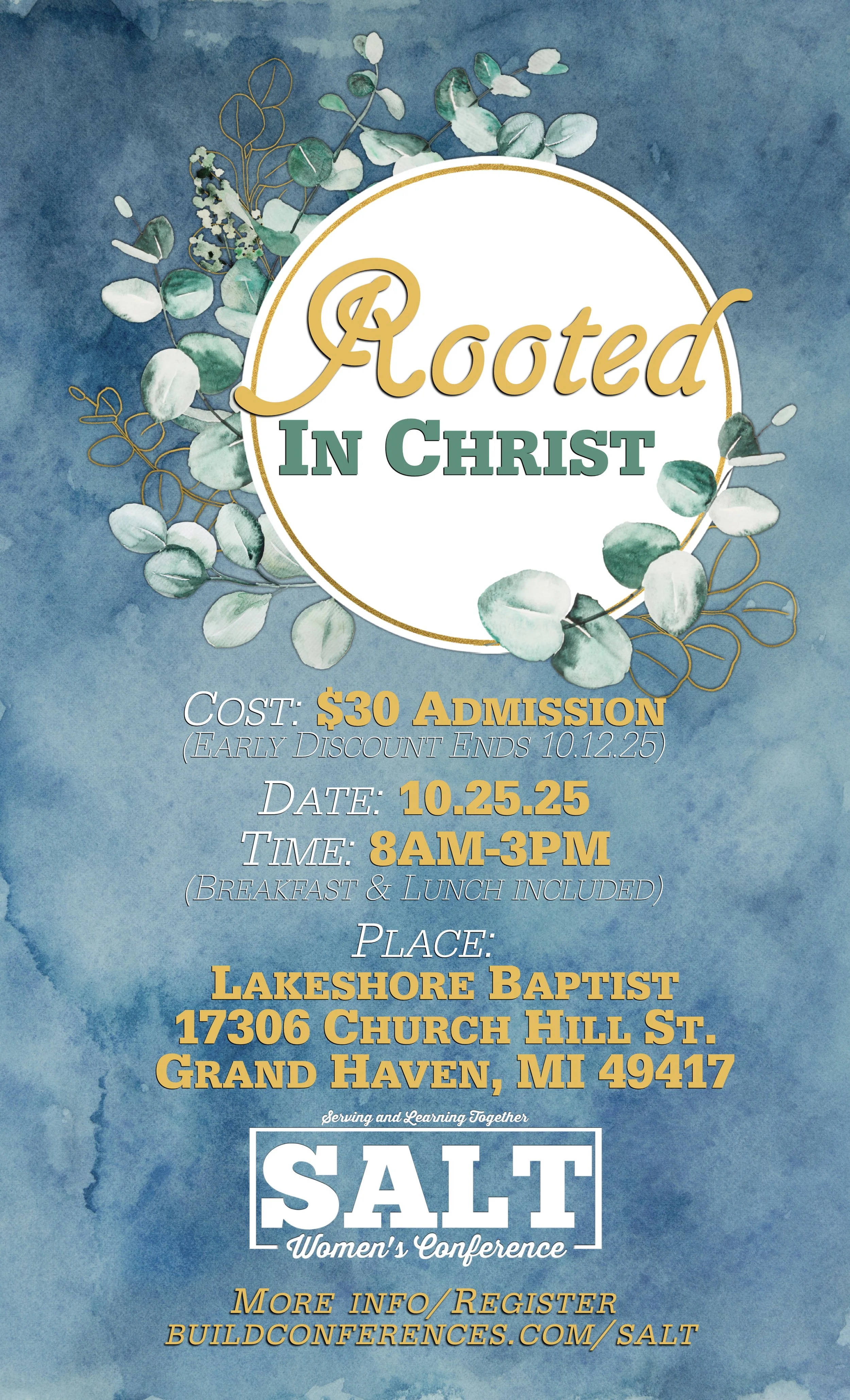Her topic is “Rooted in Christ” drawn from Col. 2:6-7. Session 1 will be about an identity IN Christ. Session 2 highlights the need for Growth in relationship with Christ and others. Session 3 will be about Being Thankful.